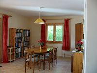 The kitchen is fitted with a six burner gas hob with extractor fan, large fridge freezer, dish-washer, microwave oven, double conventional oven and plenty of storage space.